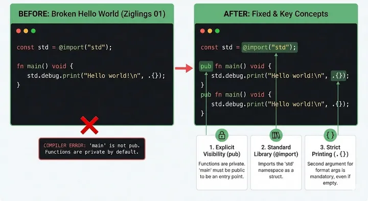 通过 Ziglings 练习理解 Zig 的函数可见性与程序入口。