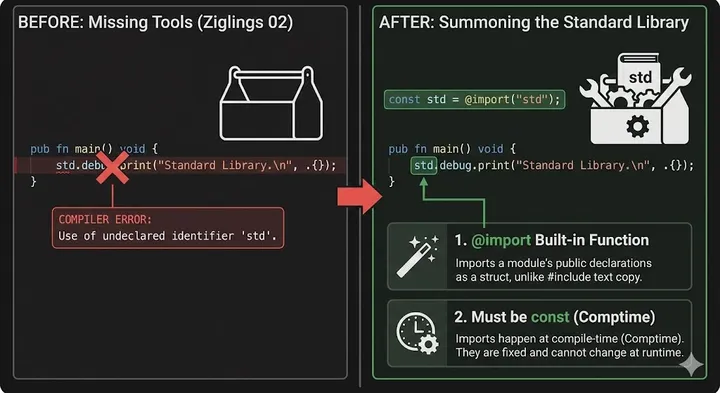 学习如何在 Zig 中引入标准库,并理解为什么导入必须是常量。
