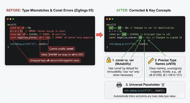 深入理解 Zig 的 const/var 声明以及整数类型的精确控制。